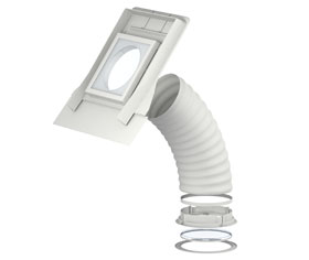 | VELUX Güneş tüneli, entegre siyah poliüretan etekliği, özel kir tutmaz katmanlı 4mm güçlendirilmiş camı ve gün ışığının odaya yayılımını sağlayan tavan ile uyumlu beyaz çerçevesi ile tüm çatı malzemeleri ile uyumludur. |