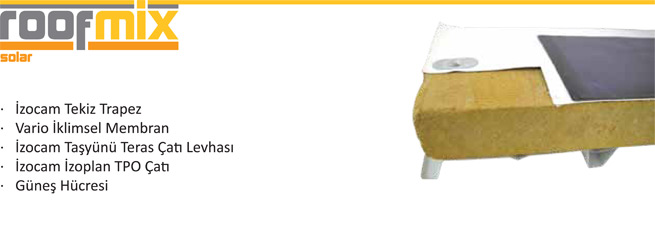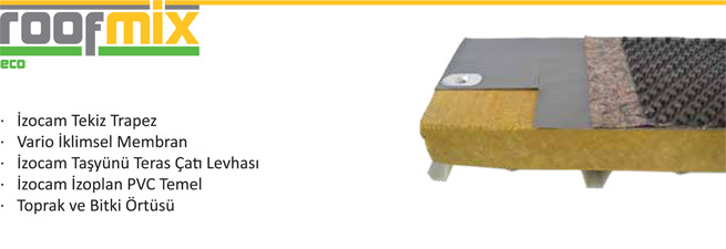 Isover Saint Gobain ve Alghanim Industries ortaklığından oluşan, yalıtım sektörünün lideri İzocam, titiz çalışmalar sonrasında düz çatılar için bütünleşik yeni sistem Roofmix’i geliştirdi. Farklı üretici ve tedarikçilerden ayrı ayrı temin edilen sistem bileşenleri yerine, tam hizmet, toplam kalite, tek çözüm anlayışıyla oluşturulan Roofmix İzocam kalite ve güvencesi ile sunuluyor.