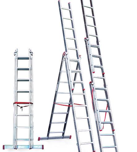Üç parçalı sürgülü A tipi alüminyum merdivenler, isteğe göre tek parça merdiven, A tipi merdiven ve A tipi üstüne sürgülü merdiven biçimlerinde kullanılabilir.