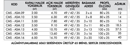 İçiçe sürgülü olarak 2 parçadan oluşan; hafif, pratik, güvenilir olarak dış cephe ve çatıya çıkışlarda v.b. gibi yerlerde kullanıma uygundur.